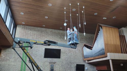 De lampen van de plafondverlichting in de kerkzaal worden vervangen door ledverlichting.