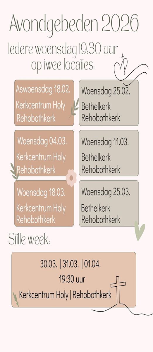Een paar keer per jaar ga ik voor in de middagdienst in de Rehobothkerk. Meestal kies ik dan voor minder bekende of lastige bijbelteksten om samen bij stil te staan. Het thema is gebedsgenezing, naar aanleiding van Jacobus 5, waar de praktijk van ziekenzalving wordt beschreven. Van harte welkom! Ds. Geert van Meijeren