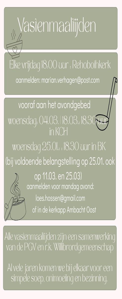 Donderdag 12 februari: Gezamenlijke avond met alle vrijwilligers die zich inzetten rondom de erediensten.